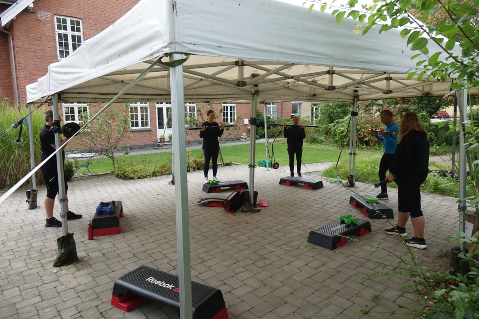 Herefter mødes vi omklædte ude i haven under pavillonen, hvor vi sammen træner en times tid.